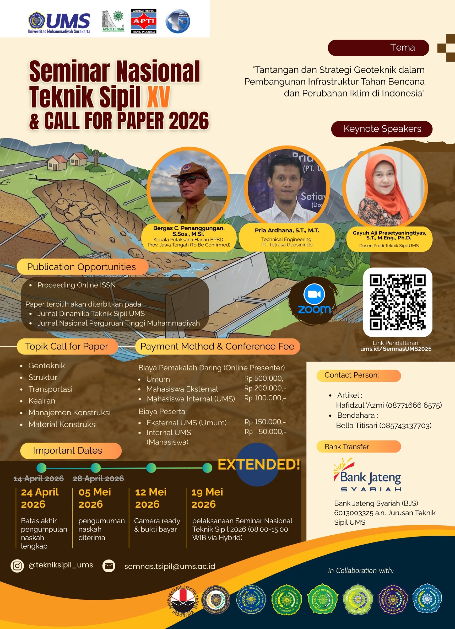 Menyikapi urgensi nasional ini, Program Studi Teknik Sipil dengan bangga mempersembahkan Seminar Nasional Teknik Sipil ke-XV Universitas Muhammadiyah Surakarta Tahun 2026 . Mengusung tema besar "Tantangan dan Strategi Geoteknik dalam Pembangunan Infrastruktur Tahan Bencana dan Perubahan Iklim di Indonesia" , forum ini diharapkan menjadi wadah pertukaran ilmu antara praktisi industri, akademisi, dan mahasiswa untuk merumuskan solusi konstruksi masa depan. Melalui paparan komprehensif dari para pemangku kebijakan, pakar geoteknik, dan sesi diseminasi hasil riset (Call for Paper), seminar ini didedikasikan untuk melahirkan gagasan solutif demi mewujudkan pembangunan infrastruktur Indonesia yang aman, inovatif, dan berkelanjutan.
