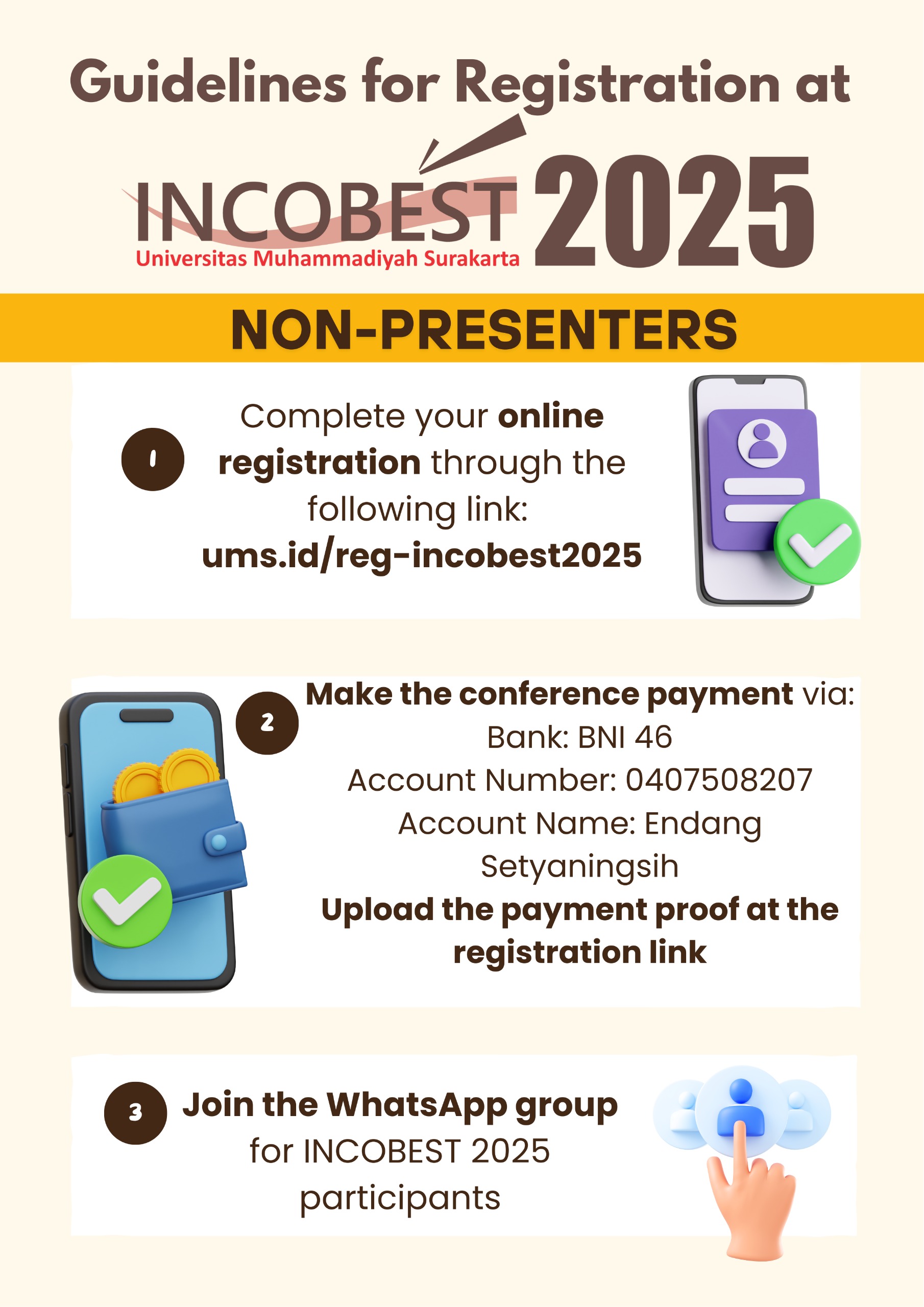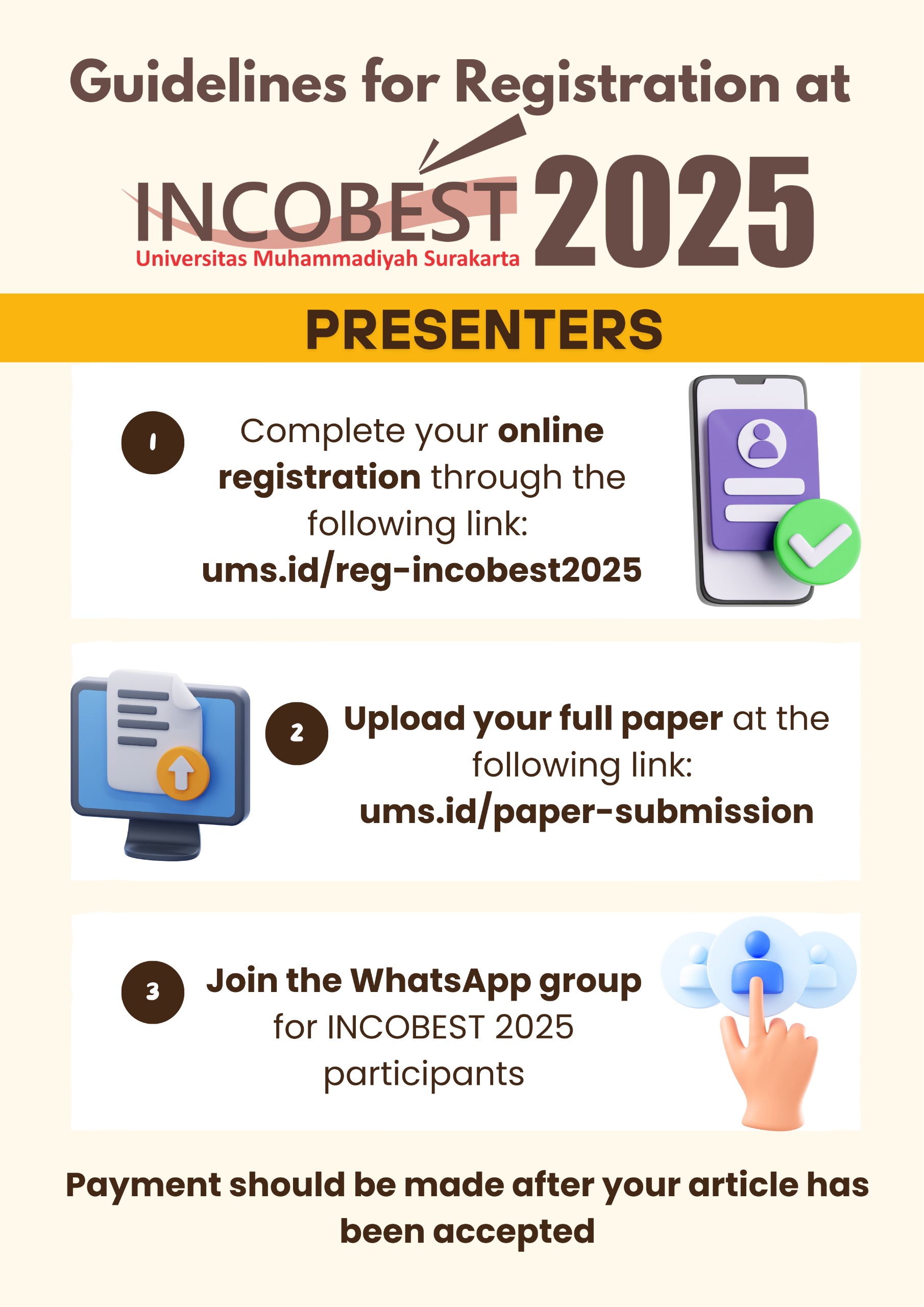 - Complete your online registration through the following link: http://ums.id/reg-incobest2025